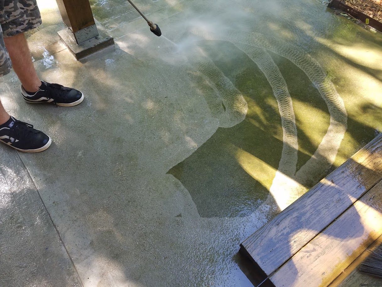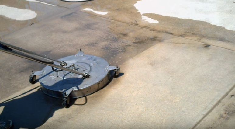 When pressure washing the floors, we use a surface cleaner along with a spray wand with a fan nozzle to avoid damaging the concrete surface.