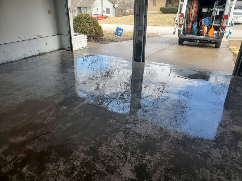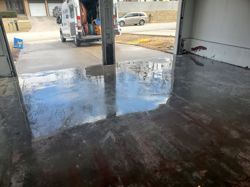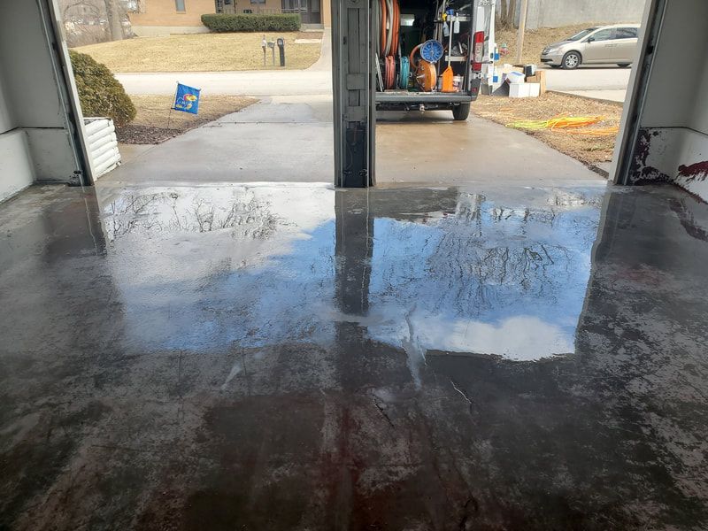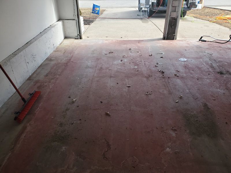 Below - Ripping paint off a garage floor with super heated water, no chemicals. In preparation for an epoxy sealing application.